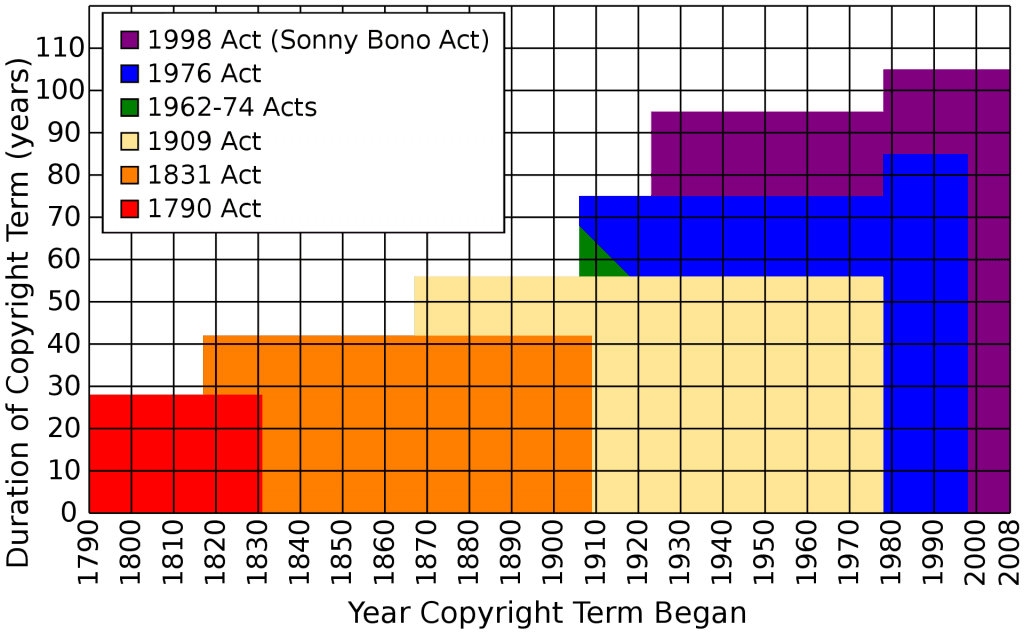 在美國的版權發展中,要讓作品跌落公眾領域(Public Domain)被有心人操作下,變得越來越複雜(https://copyright.cornell.edu/publicdomain),而隨著大出版商鼓動立法機關不斷修正法例、加上不斷的版權更新操作,版權已到達近百年的長度(參附圖)。而香港的版權法例比較簡單,主要是創作者死後五十年或匿名作品創作後五十年(香港法例528章《版權條例》,https://www.elegislation.gov.hk/hk/cap528)。