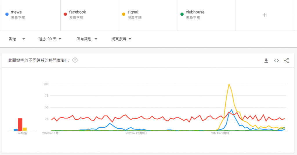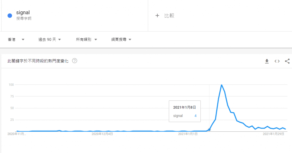 Signal作為whatsapp的直接代替者,則於2021年1月8日已經開始備受討論,但是同樣,在1月21日已經降低至一般的水平。