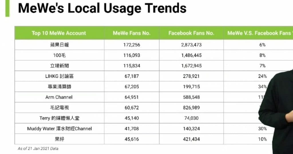 我在1月中參與了一所媒體研究機構的網絡分析公司的講座,特別討論了現在Facebook用戶的轉移,但暫時相對Facebook來說,普遍轉移的人數只有6-10%而未成氣候。該機構建議暫時由於MeWe與Facebook 發佈同樣的內容,並透過100% reach的特色,嘗試接觸一些平時在Facebook算法下未能觸及的受眾。