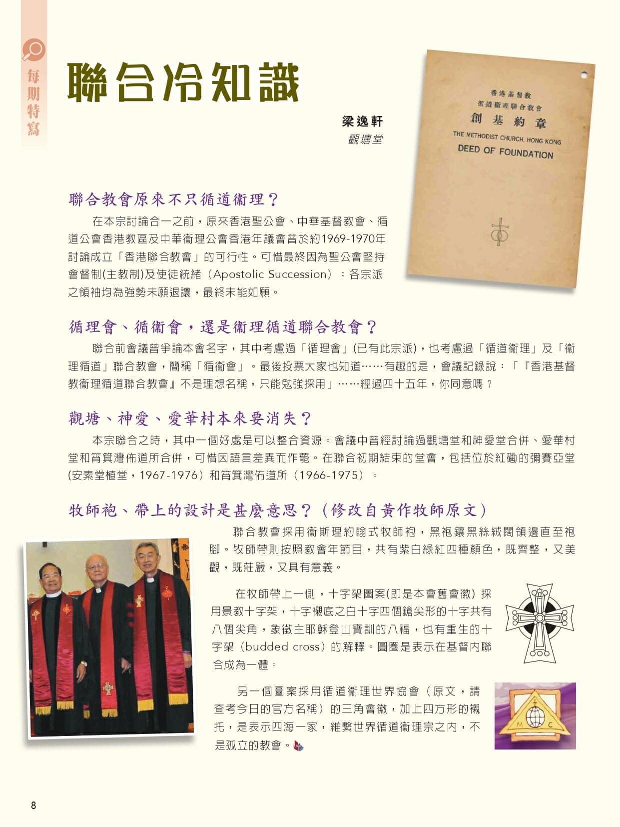 聯合教會原來不只循道衞理? 在本宗討論合一之前,原來香港聖公會、中華基督教會、循道公會香港教區及中華衞理公會香港年議會曾於約1969-1970年討論成立「香港聯合教會」的可行性。可惜最終因為聖公會堅持會督制(主教制)及使徒統緒(Apostolic Succession);各宗派之領袖均為強勢未願退讓,最終未能如願。 循理會、循衞會,還是衞理循道聯合教會? 聯合前會議曾爭論本會名字,其中考慮過「循理會」(已有此宗派),也考慮過「循道衞理」及「衞理循道」聯合教會,簡稱「循衞會」。最後投票大家也知道⋯⋯有趣的是,會議記錄說:「『香港基督教衞理循道聯合教會』不是理想名稱,只能勉強採用」⋯⋯經過四十五年,你同意嗎? 觀塘、神愛、愛華村本來要消失? 本宗聯合之時,其中一個好處是可以整合資源。會議中曾經討論過觀塘堂和神愛堂合併、愛華村堂和筲箕灣佈道所合併,可惜因語言差異而作罷。在聯合初期結束的堂會,包括位於紅磡的彌賽亞堂(安素堂植堂,1967-1976)和筲箕灣佈道所(1966-1975)。 牧師袍、帶上的設計是甚麼意思?(修改自黃作牧師原文) 聯合教會採用衞斯理約翰式牧師袍,黑袍鑲黑絲絨闊領邊直至袍腳。牧師帶則按照教會年節目,共有紫白綠紅四種顏色,既齊整,又美觀,既莊嚴,又具有意義。 在牧師帶上一側,十字架圖案(即是本會舊會徽) 採用景教十字架,十字襯底之白十字四個鎗尖形的十字共有八個尖角,象徵主耶穌登山寶訓的八福,也有重生的十字架(budded cross)的解釋。圓圈是表示在基督內聯合成為一體。 另一個圖案採用循道衞理世界協會(今稱世界循道衛理宗協會)的三角會徽,加上四方形的襯托,是表示四海一家,維繫世界循道衞理宗之內,不是孤立的教會。